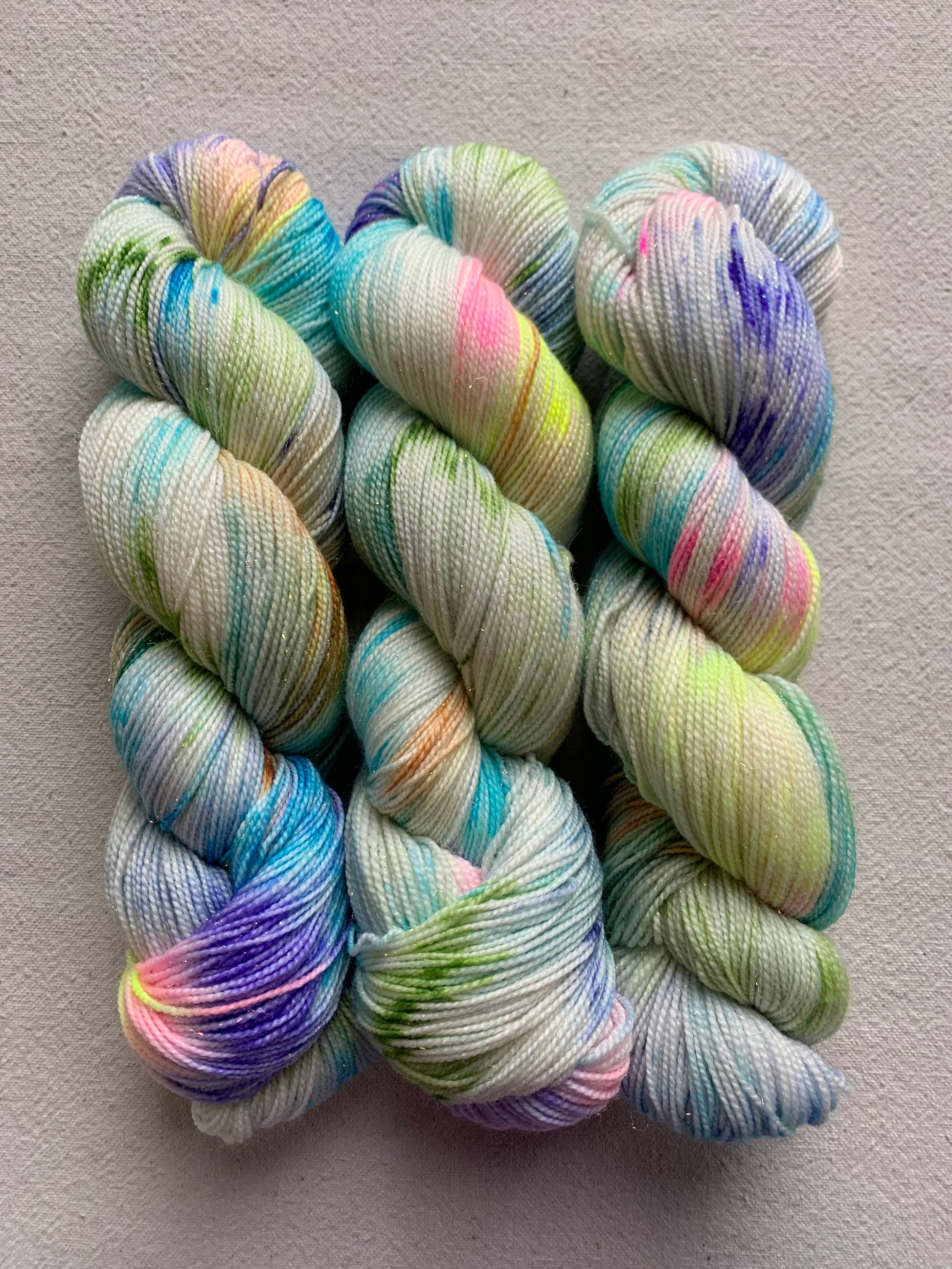 One colorway however will stay the same within the usual variations that come with hand dyed yarn - Points of Light. Here, I applied all the colors I used in the 4 elements colorways to make a multi-colored, fun colorway that plays well with a lot of the semisolids.