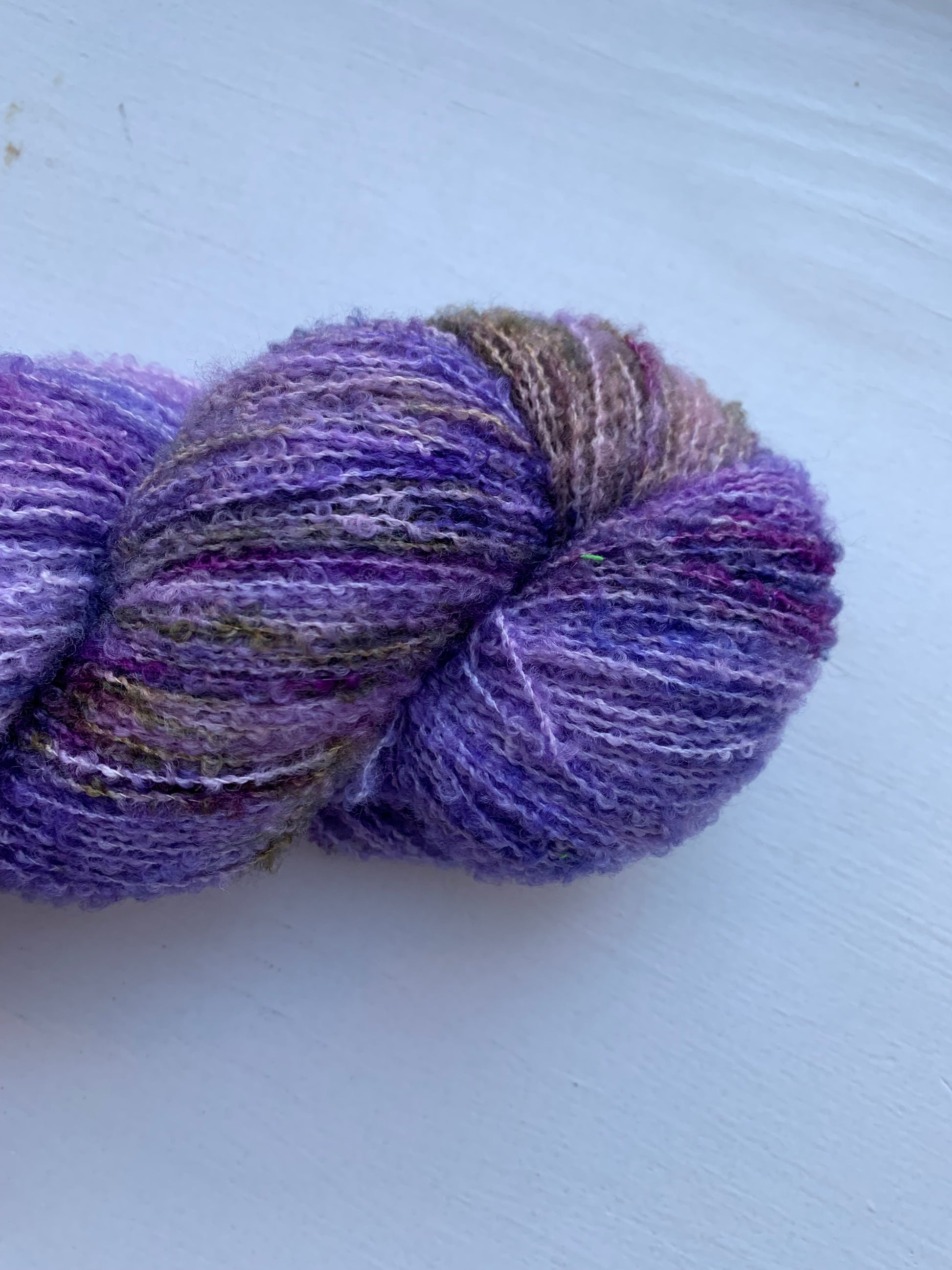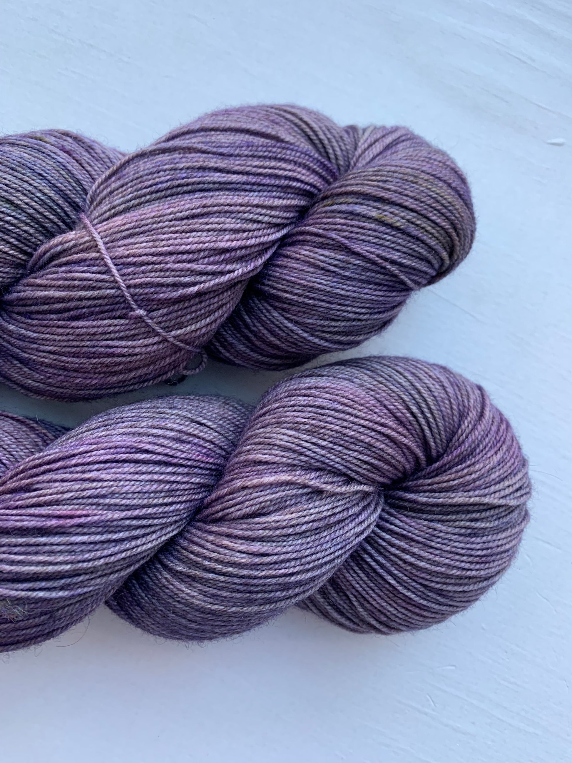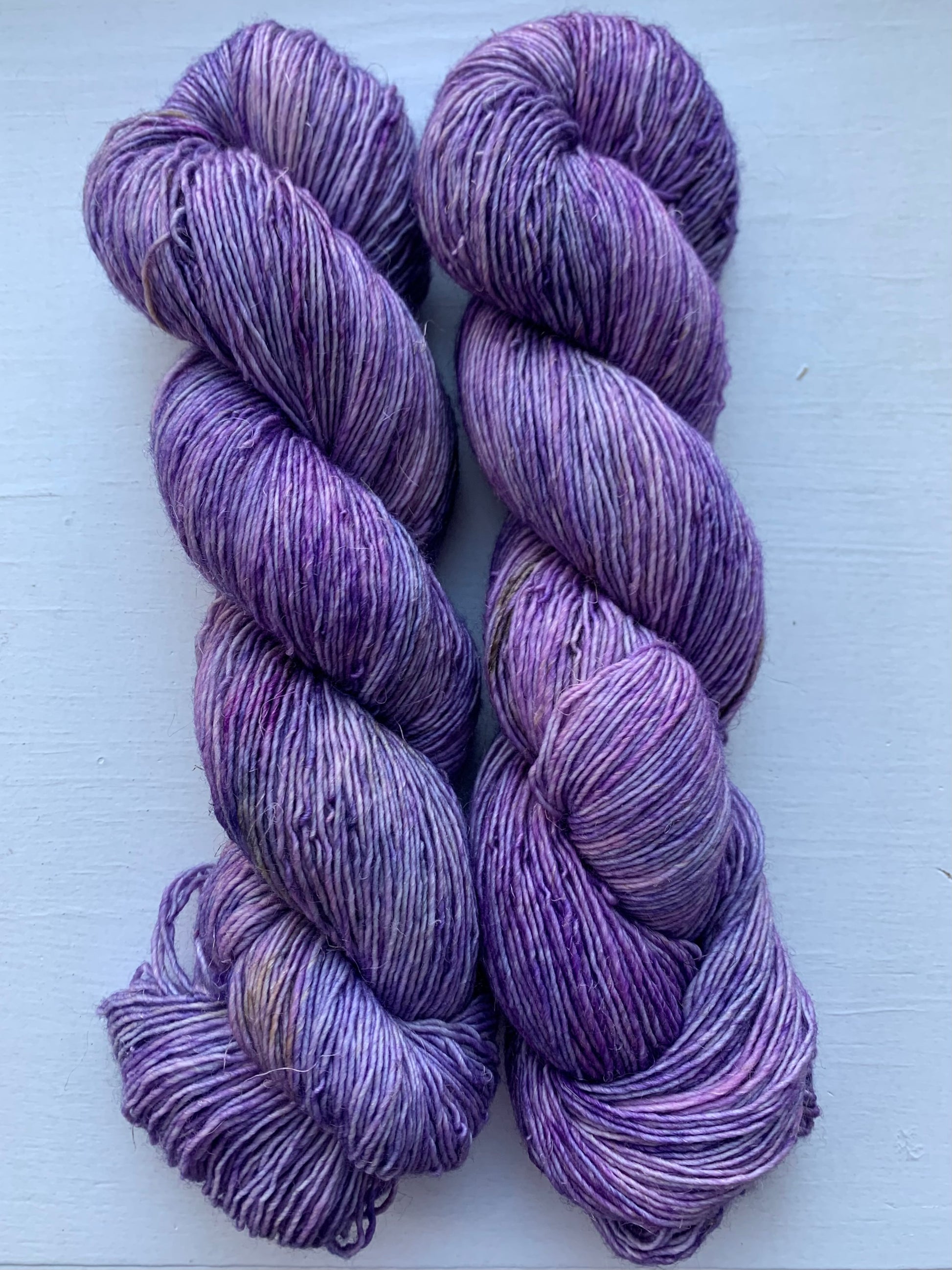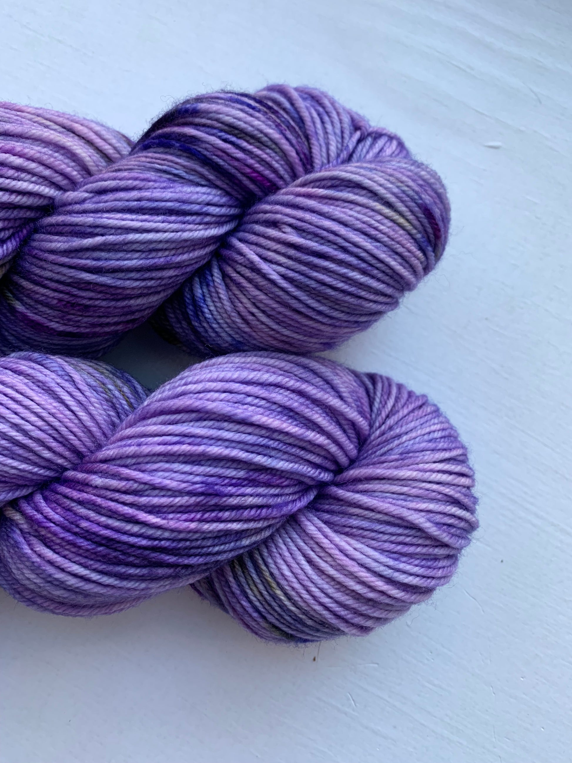 The Periwinkle Sheep’s yearlong, special colorway is a symphony of lavender, purple, and of course - periwinkle. Added is a glaze of light purple tinted grey, and a bit of earthy green and brown.