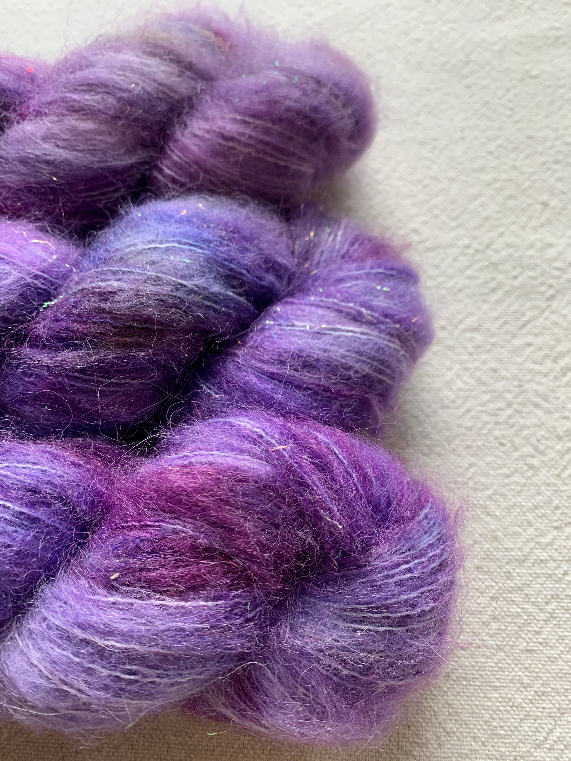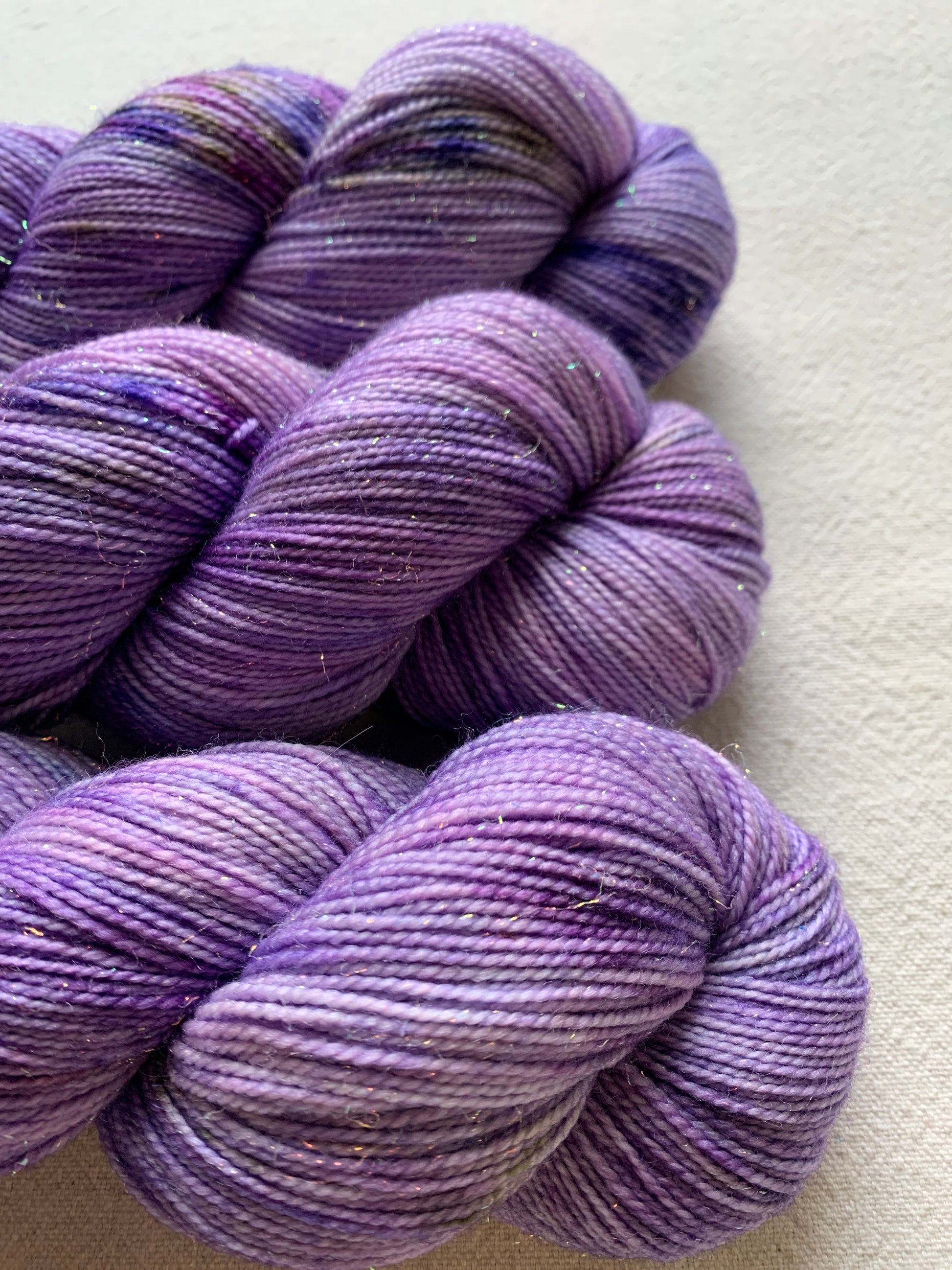 The Periwinkle Sheep’s yearlong, special colorway is a symphony of lavender, purple, and of course - periwinkle. Added is a glaze of light purple tinted grey, and a bit of earthy green and brown.