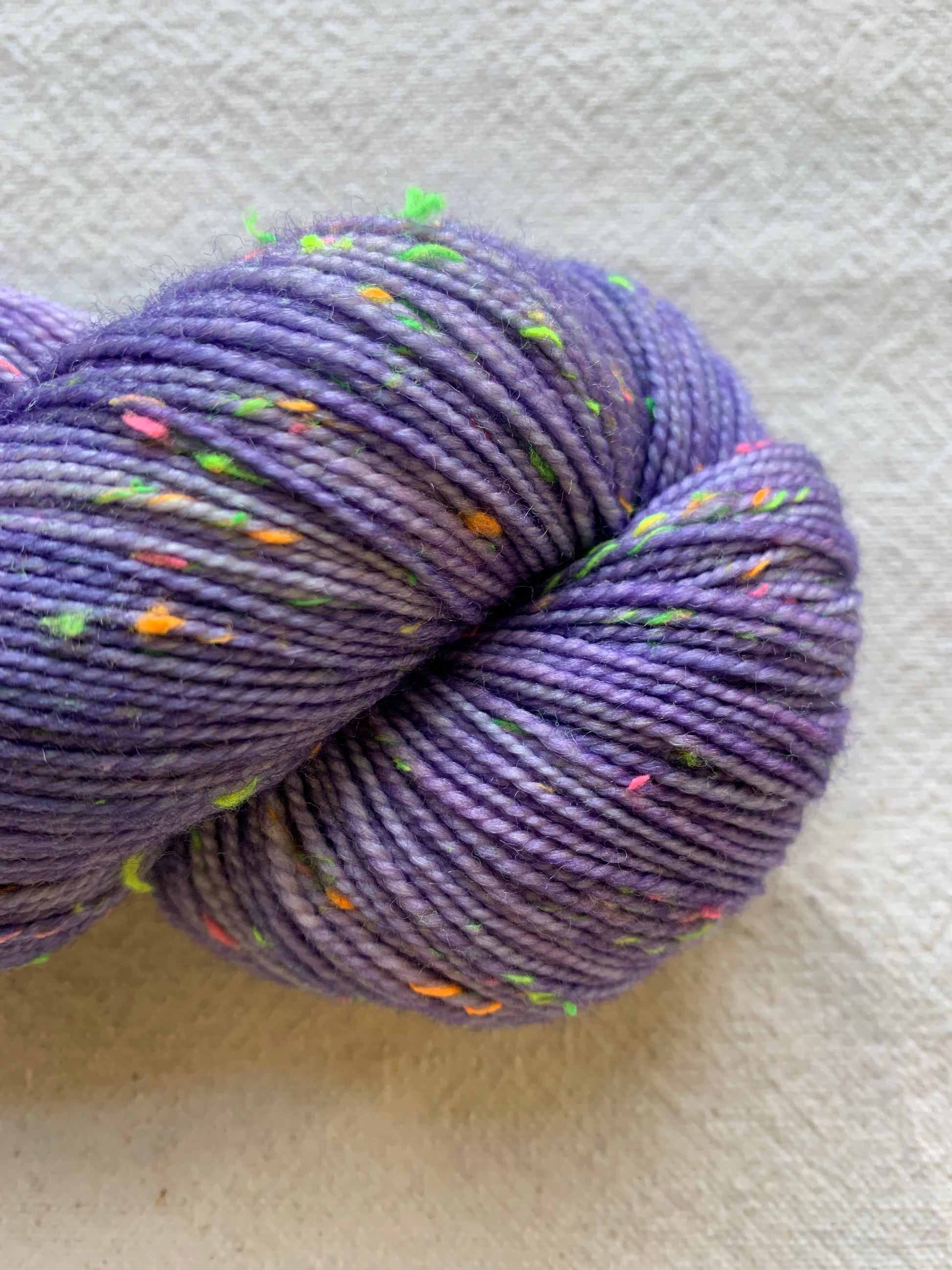 Imagine a yarn like Donegal tweed - except the flecks and neps are neon pink, yellow, and green! These colorful neps make the yarn look like confetti fell on it.